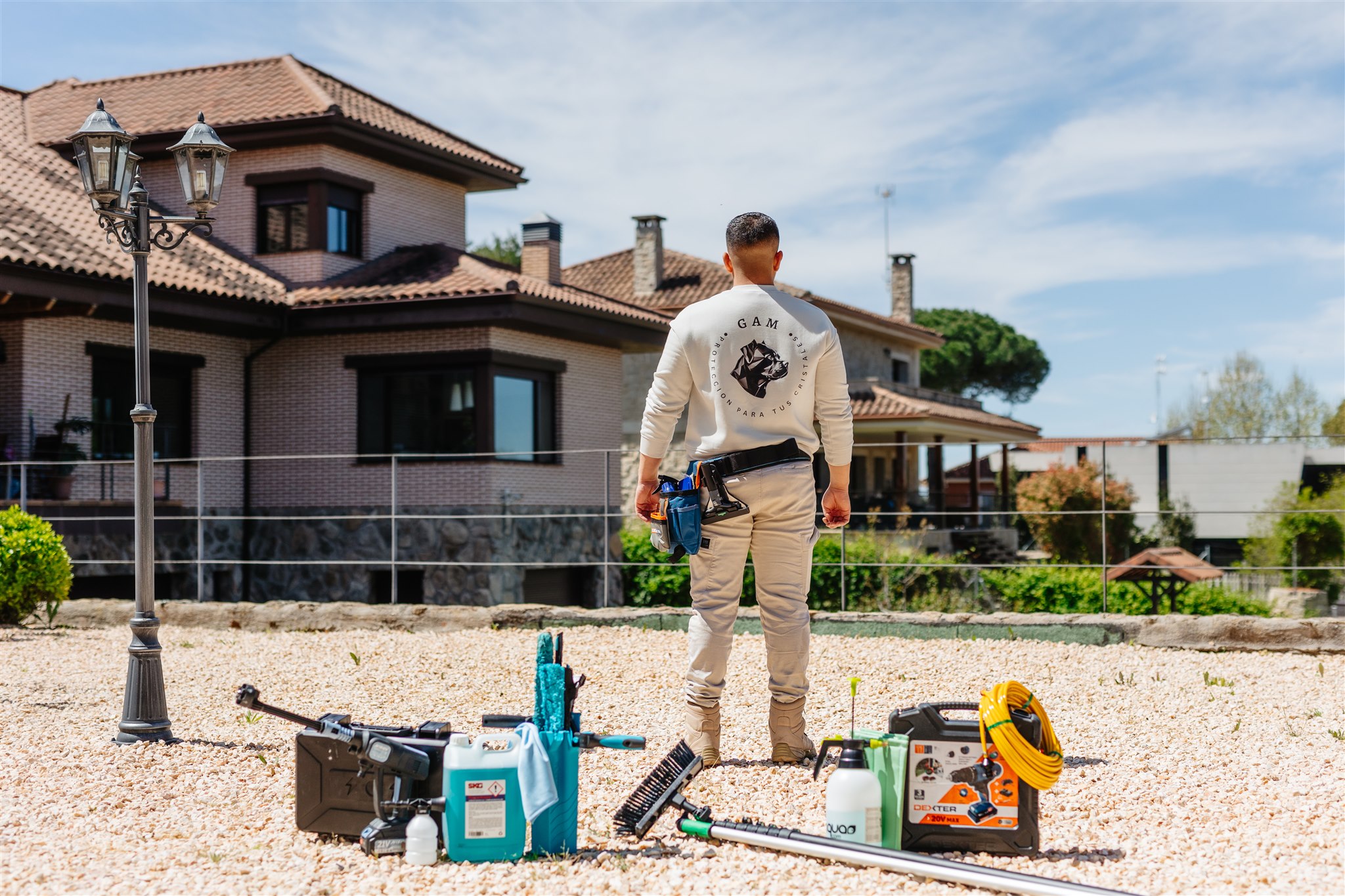 Para exteriores usamos agua osmotizada (agua pura) que no deja marcas ni velos y no daña materiales ni vegetación (flores, jardines). Evitamos químicos agresivos que otros proveedores utilizan.